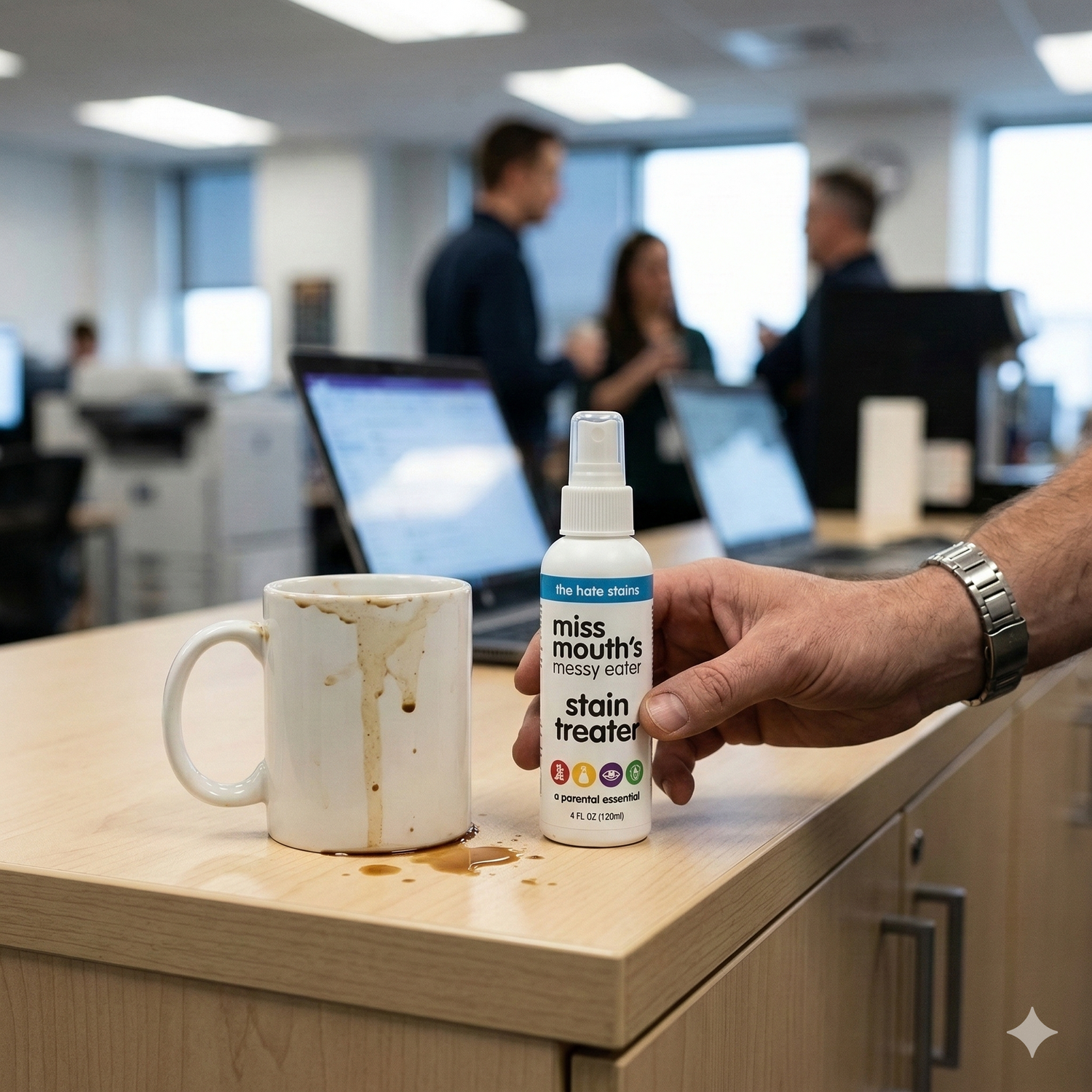 Ai vărsat cafeaua pe cămașă? Pulverizează Miss Mouth’s, tamponează și mergi la ședință cu încredere. Pata dispare, iar tu arăți impecabil.
